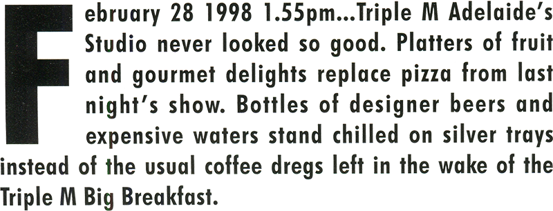 3:15pm… my newfound confidence diminishes with the good news that Noel is now running early… he’s approximately three minutes away. I remind myself to breathe. Moments later, a Triple M staff member pops in (there are a lot more of them than usual hanging around the studio and they’re all looking very glamorous… maybe I shouldn’t have torn the sleeves off Page ‘n’ Plant!?)